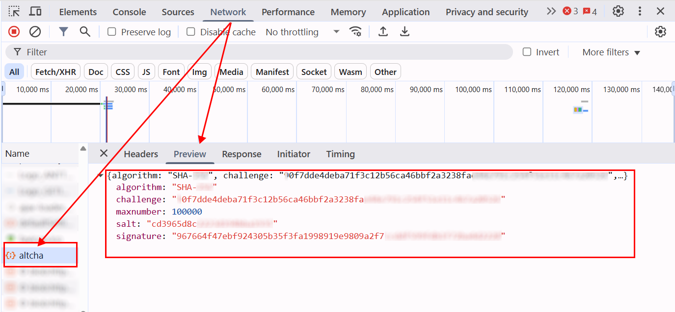 Open the Altcha page in your browser, launch DevTools (F12 or Ctrl+Shift+I), and go to the Network tab.