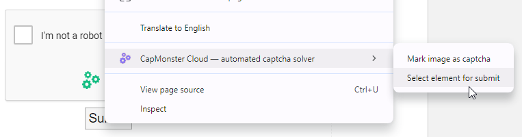 - In the opened menu, select CapMonster Cloud - automated captcha solver → Select element for submit.