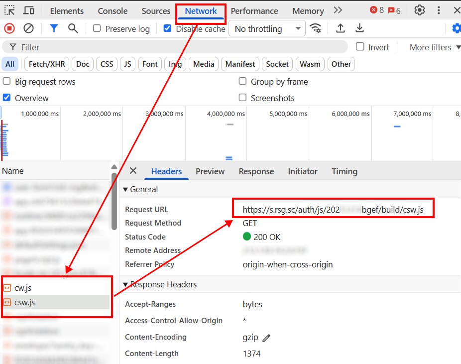 Nas Ferramentas do Desenvolvedor, vá para a aba Network, ative o Castle e analise as requisições de rede. Encontre as requisições para os arquivos cw.js e csw.js e copie suas URLs.