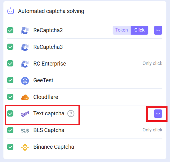 - Na extensão, abra Text captcha → Settings (botão roxo com uma seta).