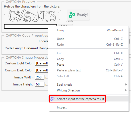 - Clique com o botão direito no campo de entrada da resposta e selecione Selecionar um campo para o resultado da captcha no menu que abrir.