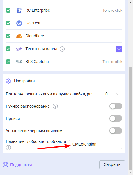 delayStartCount | Array<{[CaptchaType]: Number}> | Задержка перед решением капчи |