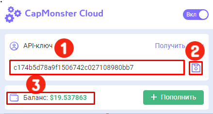 Введите API-ключ в соответствующее поле(1), нажмите кнопку Сохранить(2). Если вы ввели правильный ключ, то ниже отобразится ваш баланс(3)