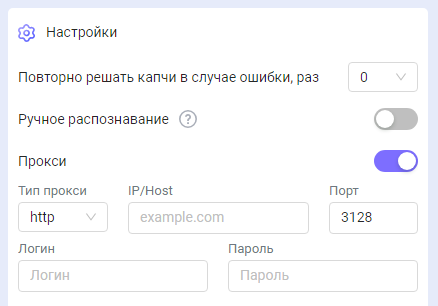 Здесь можно указать прокси, который будет отправлен вместе с задачей на распознавание.