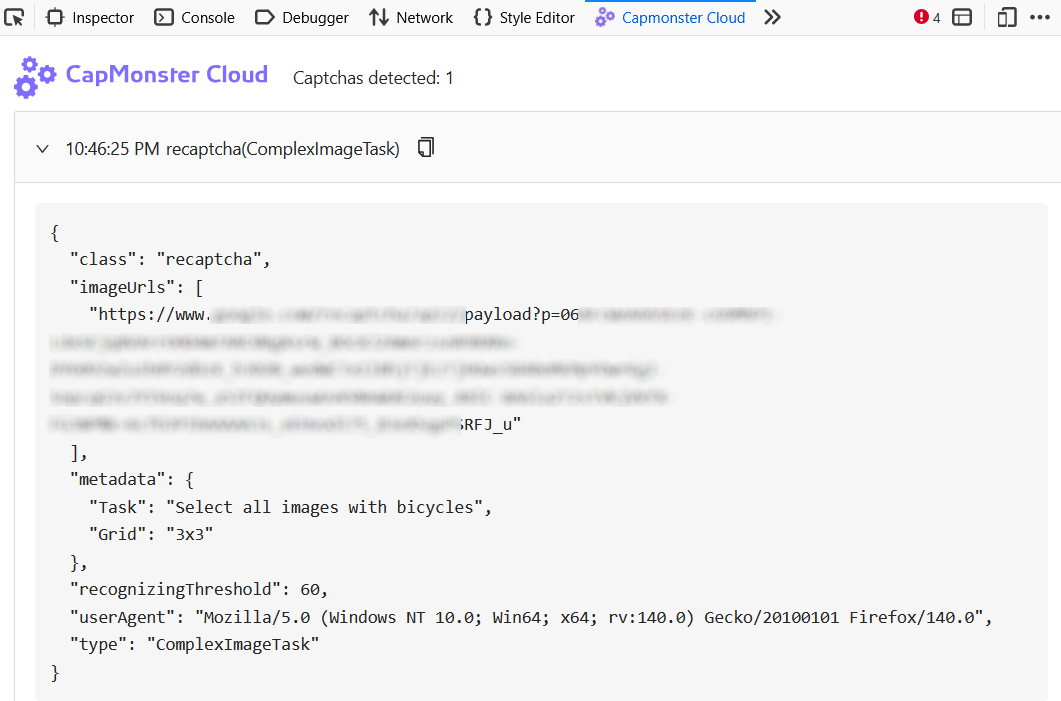 CapMonster Cloud 扩展程序提供了一种便捷方式,可用于查看各种验证码类型所需的参数,从而正确发送至服务器并成功完成识别。所显示的数据有助于确认所传参数的准确性,并可作为构建 API 请求的示例。