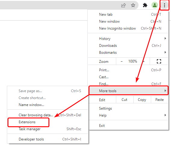 - 从菜单中:点击右上角的三个竖点(靠近个人资料图片),然后选择“更多工具”,然后选择“扩展程序”。