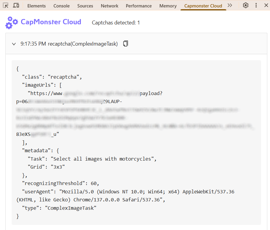 CapMonster Cloud 扩展程序提供了一种便捷方式,用于查看各种验证码类型所需的参数,以便正确发送至服务器并成功完成识别。显示的数据有助于验证参数的准确性,并可作为构建 API 请求的示例。