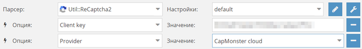 要解决标准验证码,请选择“Util::Antigate”并将“api.capmonster.cloud”指定为“Antigate domain”的值。在“key”字段中指定您的个人 API 密钥。