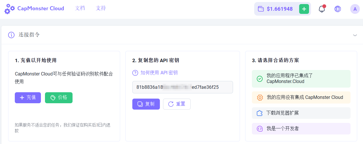 只需将 CapMonster Cloud 浏览器扩展安装到 Chromium 引擎的项目中,输入 API 密钥即可像在 Chrome 中一样操作。