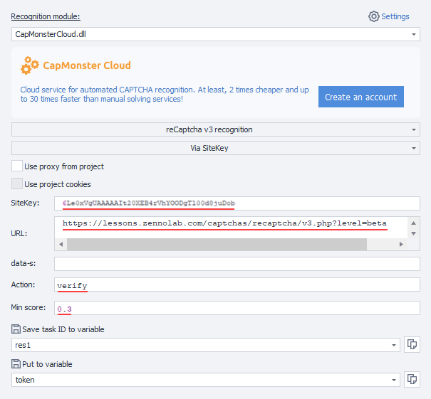 2. 识别 ReCaptcha 操作的属性中选择模块 CapMonsterCloud.dll,指定验证码类型(reCAPTCHA v.3),解题方式(在选项卡中通过 Sitekey),并填写 ActionminScore